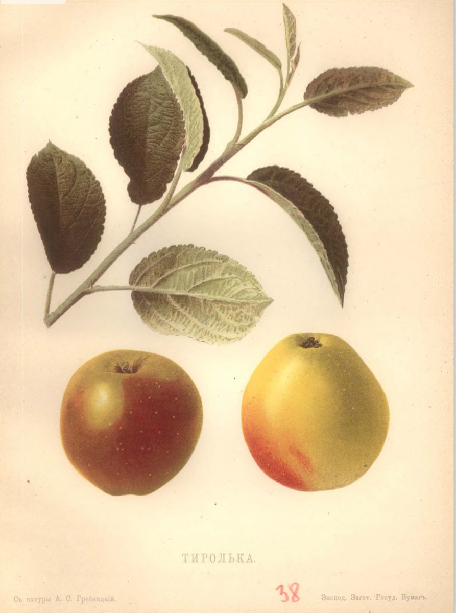 Происхождение и распространение Сорт несомненно русского (местного) происхождения, имя родоначальника неизвестно. Был издавна и массово распространен исключительно в юго-западном углу Российской империи — в долинах Днестра, в Подольской, Киевской, Полтавской и Бессарабской губерниях. В других регионах и за границей он был практически неизвестен. За внешнее сходство плодов его иногда сравнивали с зарубежными сортами (Credes Taubenapfel, Rother Rosmarinapfel) или Пепинкой Литовской, но Тиролька является абсолютно самостоятельным сортом. Синонимы: Каролька (искаженное), Тиролька Подольская, Тиролька Бессарабская, Тиролька белая, Крымское, Синап, Синопка, Голубок Красный Зимний, Белый зимний голубок. Важно не путать этот сорт с настоящим Тирольским яблоком (Белым Розмарином), а также с полосатыми разновидностями, которые иногда ошибочно называли “Тиролькой”.