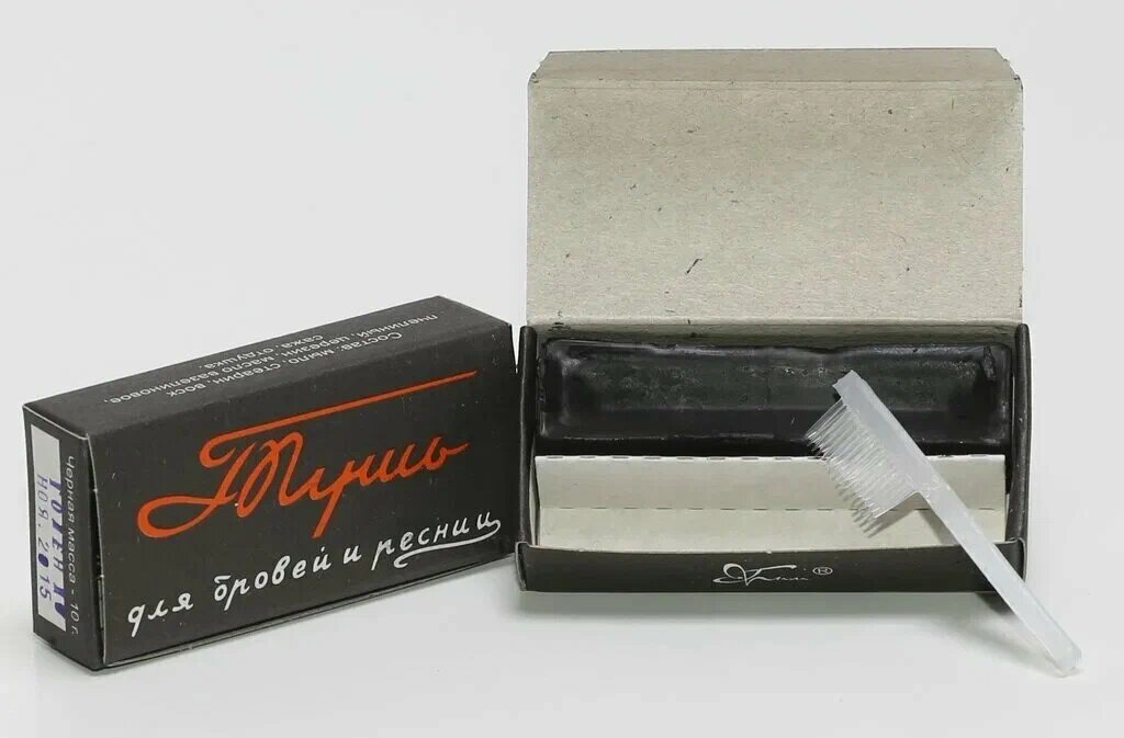 Помните этот специфический утренний ритуал? Достать маленькую черную коробочку, аккуратно смочить брусочек (да-да, тем самым способом, за который тушь и прозвали «плевалкой»), потереть пластмассовой щеточкой и нанести на ресницы. А потом — самый опасный этап: разделение слипшихся ресниц иголкой или булавкой. Сегодня это кажется экстремальным бьюти-хоррором, но для советской женщины это был единственный путь к выразительному взгляду. Та самая тушь в картонной коробочке была практически в каждой косметичке. Состав был максимально натуральным, но суровым: мыло, сажа, пчелиный воск и вазелиновое масло. Стоило это удовольствие всего 40 копеек, и одного брусочка могло хватать на годы. Главный минус — если вы попадали под дождь или, не дай бог, плакали, мыло в составе начинало нещадно жечь глаза. Но был и плюс: такая тушь ложилась очень густо, создавая эффект «драматического взгляда». А чтобы ресницы не выглядели «паучьими лапками», в ход шли иголки. Одно неловкое движение в переполненном авт