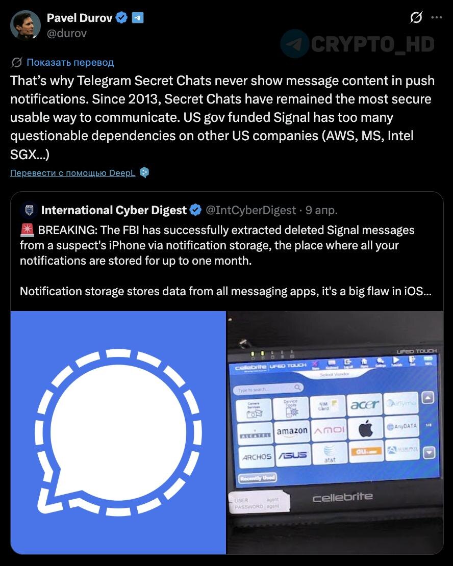 ✈️ Павел Дуров: Секретные чаты Telegram – самый безопасный способ общения с 2013 года. Содержимое сообщений в секретных чатах никогда не отображается в push-уведомлениях – это сделано специально для повышения приватности. При этом основатель Telegram раскритиковал Signal, отметив, что сервис, финансируемый правительством США, имеет «слишком много спорных зависимостей» от американских компаний (AWS, Microsoft, Intel SGX). Контекст: В ФБР смогли извлечь удаленные сообщения Signal с iPhone через хранилище уведомлений iOS, где данные могут сохраняться до одного месяца. Ранее: цифровое сопротивление Crypto Headlines