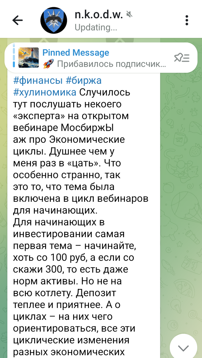 "Случилось тут послушать некоего «эксперта» на открытом вебинаре Мосбиржи про экономические циклы. Душнее, чем у меня, раз в «цать». Что особенно странно, так это то, что тема была включена в цикл вебинаров для начинающих.