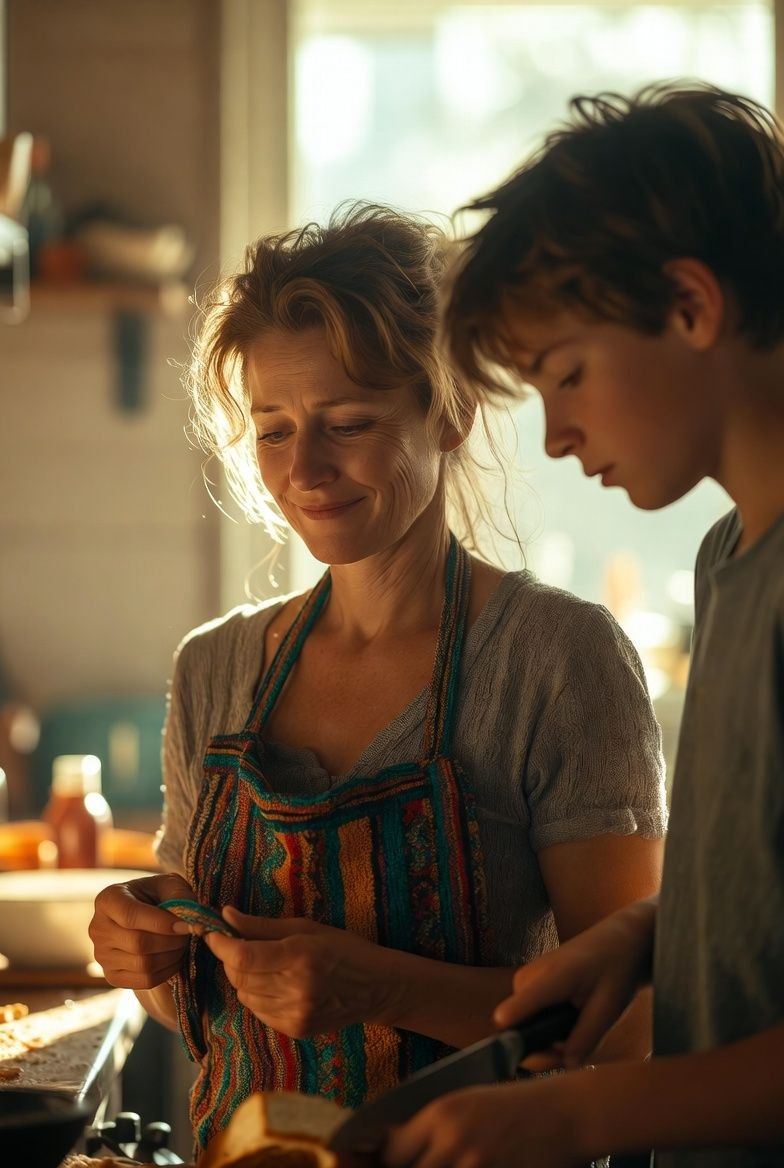 Она посмотрела на него — взрослого, неловкого, сосредоточенно режущего хлеб криво — и почувствовала что-то очень тёплое.