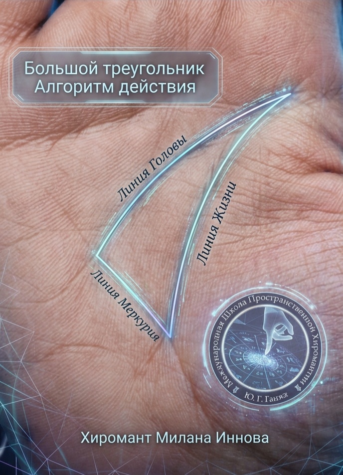 🖍БОЛЬШОЙ ТРЕУГОЛЬНИК = линия Жизни (жизненные силы/активность/качество жизни) + линия Головы (интеллект/психика) + линия Меркурия(здоровье/коммуникации/финансы).