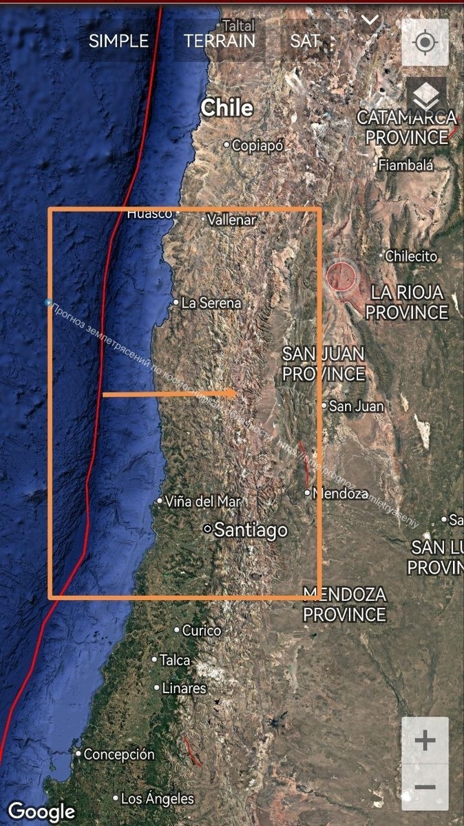 Есть вероятность землетрясения М5.7+ на границе Чили и Аргентины в отмеченной зоне в течение 9 дней