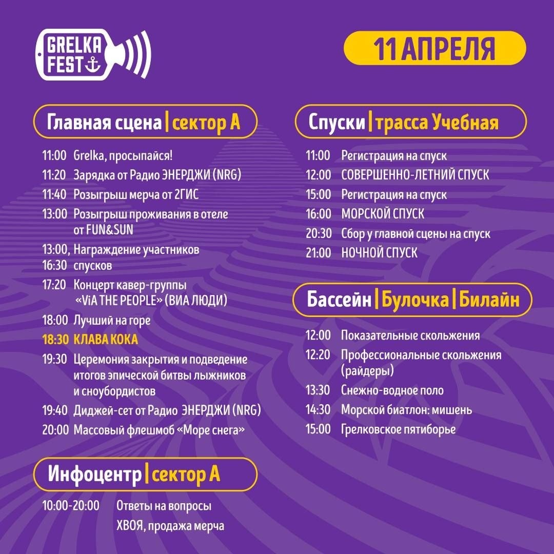 День 3 Сразу три спуска — Совершенно-летний, Морской и Ночной. Показательные прыжки и соревновательные активности на бассейне. Погода шепчет! Концерт Клавы Коки. Церемония закрытия, итоги битвы лыжников и сноубордистов.