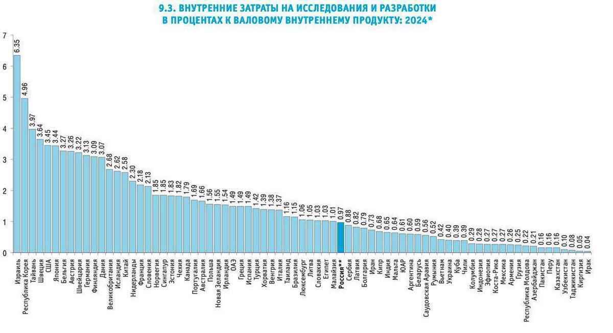 Внутренние затраты на исследования и разработки в России составили 0.97 % ВВП