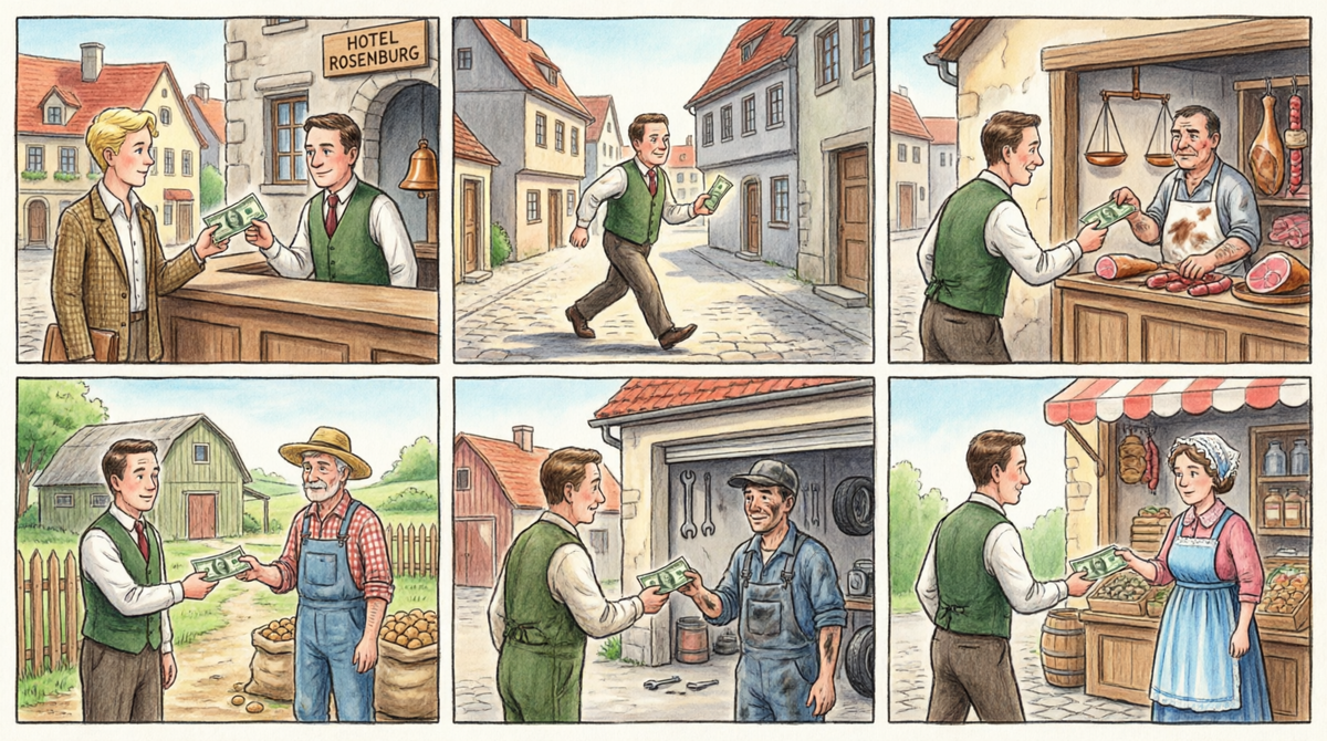 Зажиточный турист приехал в город, В гостинице сто долларов в залог, Оставил и пошёл до верхних комнат, Чтоб выбрать, разместиться, где он смог. Тем временем, хозяин, с той купюрой, Бежит в мясную лавку долг отдать, Мясник свинарке, хоть она и дура, За мясо надо деньги отдавать. Та побежала в автомастерскую, Машину из ремонта, чтоб забрать, Механик в магазин несёт купюру, И просит за продукты рассчитать. Хозяин магазина, взяв бумажник, До проститутки, что даёт взаймы, Бежит, надеясь помочить свой пальчик, Но прибежал в критические дни. Путана за квартиру задолжала, Хозяину гостиницы, давно, И с радостью сто долларов отдала, Что бы, как прежде, всё по маслу шло. Тем временем, турист пришёл с осмотра, Сказал, что не по нраву ему здесь, Вернул залог хозяин, с чувством долга, За то счастливым стал их город, весь. Ни кто не получил себе ни цента, Но должники раздали все долги, Готовы, вновь, давать в долги клиентам, Так городок решил дела свои. МОРАЛЬ: Отдачей красен долг бывает только, От