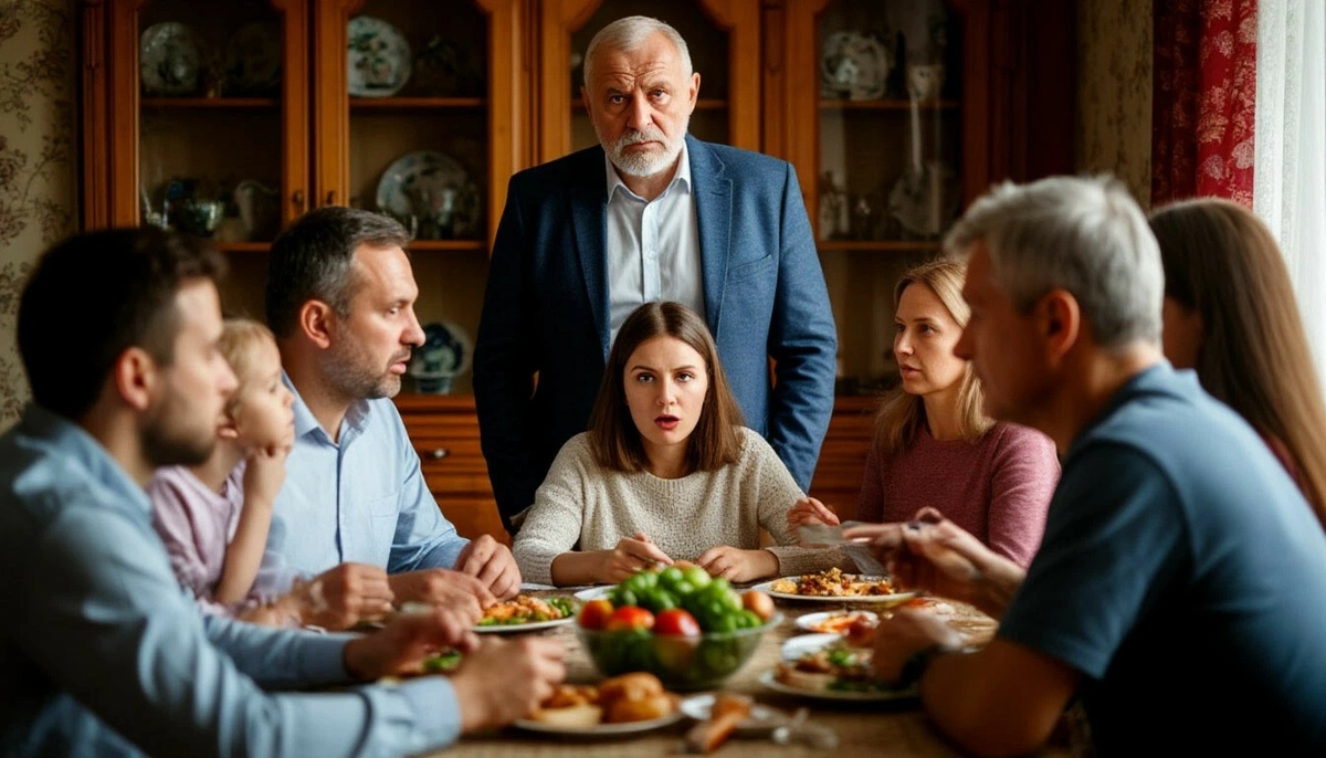 Гости молчали. Кто-то начал подниматься из-за стола. Кто-то, наоборот, вжался в стул, будто хотел стать невидимым. Дядя Женя, который полчаса назад шептался с тётей Ниной о моём «разбитом рыле», теперь смотрел в свою тарелку и жевал салат с таким видом, будто решал уравнение с четырьмя неизвестными.