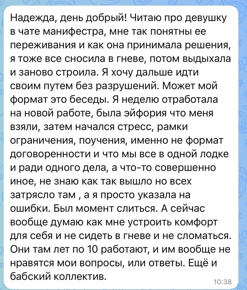 Прилетел комментарий. Размещаю с разрешения. Тоже женщина-манифестор