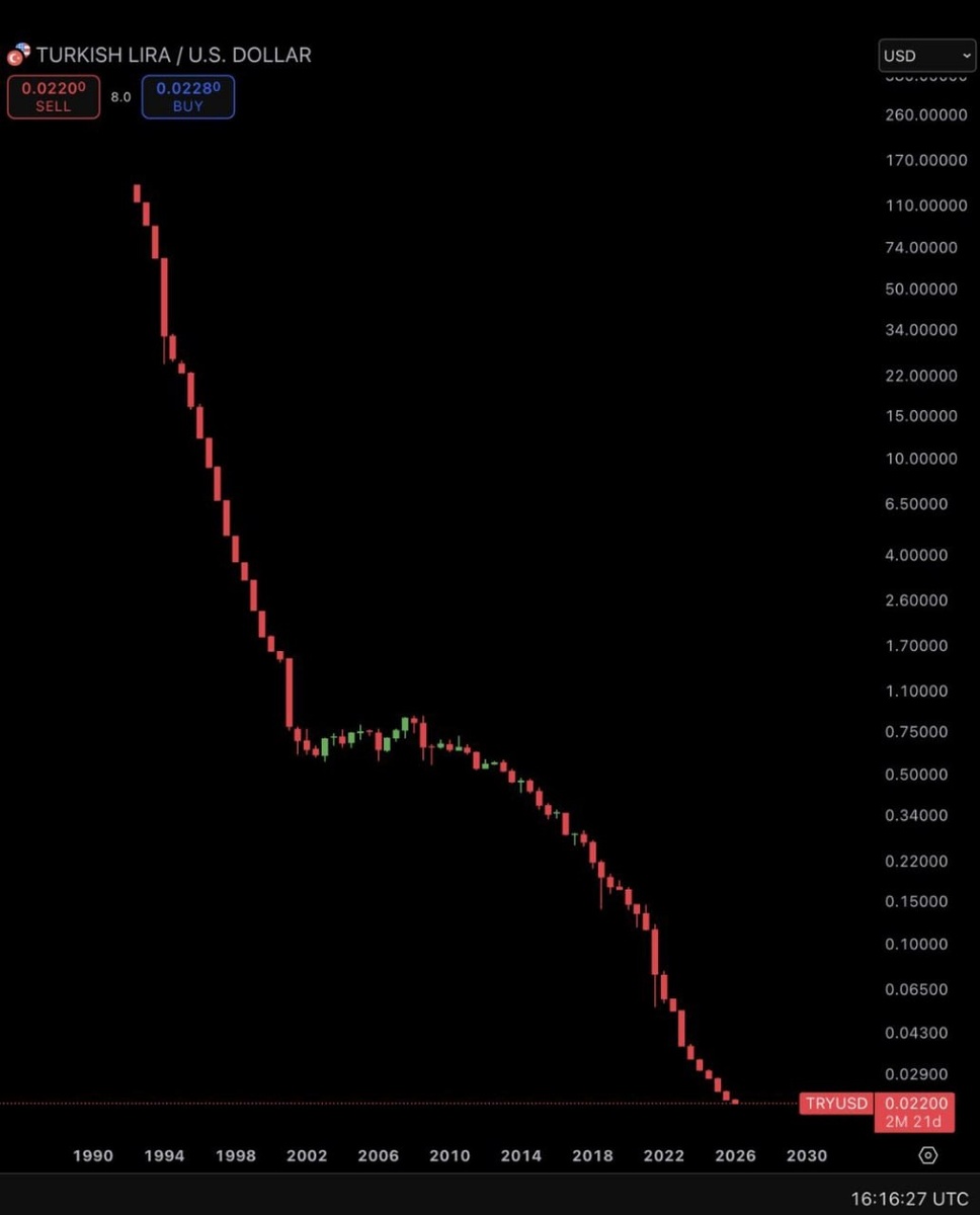 🔸Турецкая лира обвалилась на −99,99% по отношению к доллару США от своего максимума
