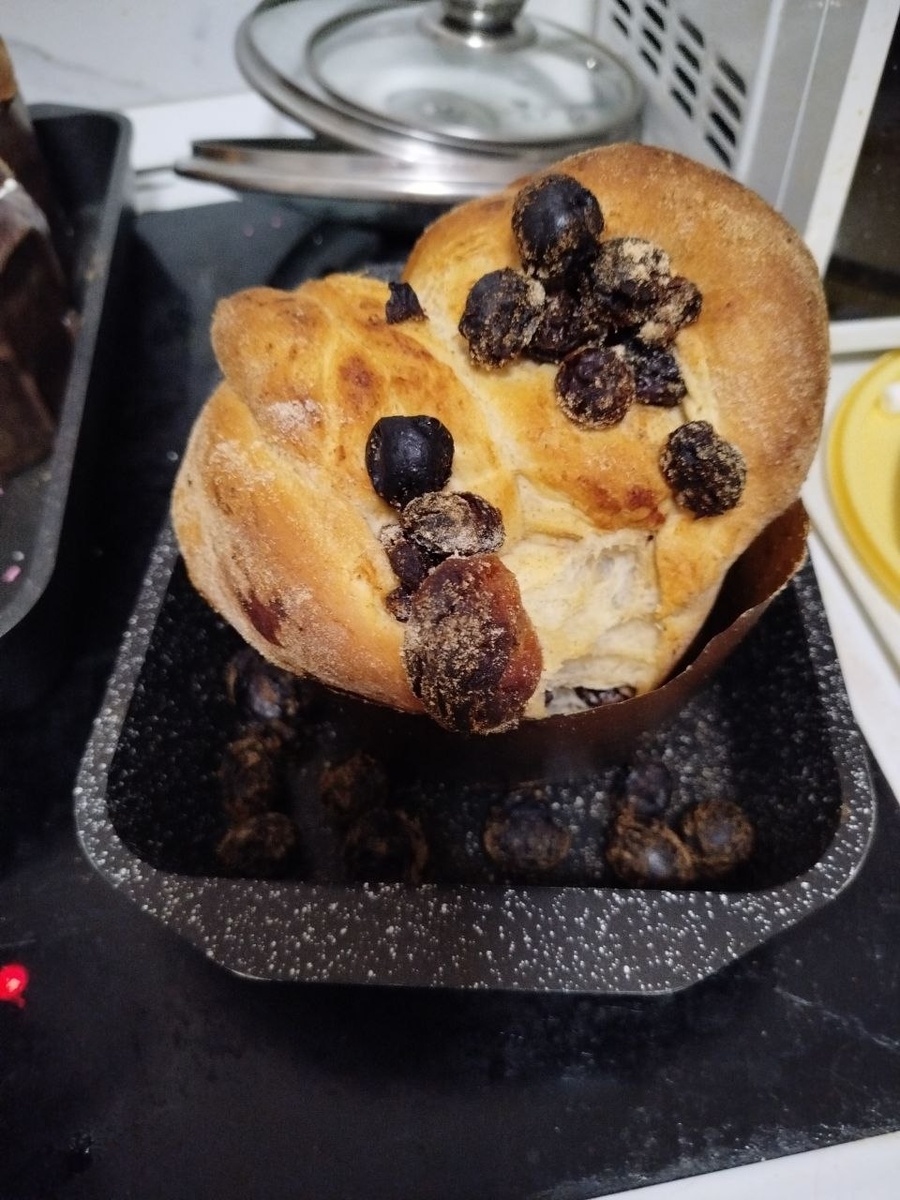 У меня всего 7 куличей, седьмой я пекла отдельно, так как на противень вместе с остальными не поместился, вот на фото видно, какой он без формы, форма порвалась, и я ее сняла