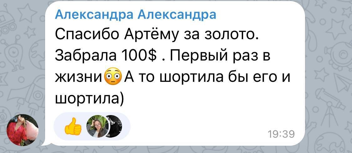 Первый раз в жизни…» На курсе «Уверенный трейдер» в личной группе со мной прошла первая практика, где мы уже на второй неделе обучения пошли в реальные сделки на рынке. И вот первые результаты: вовремя заметила движение, подхватила его, забрала свои первые 100 долларов. И главное в её словах: «А то бы шортила и шортила его». Понимаете, о чём речь? Когда нет системы, то ты просто тыкаешь в одну сторону и молишься. А когда есть алгоритм, ты видишь движение и подхватываешь его. В ту сторону, куда рынок реально идёт. Всё возможно. Но нужно знать, с чего начать 😎 Через 2 дня стартует бесплатный курс «Первая сделка». 4 дня, эфиры-уроки, полезные материалы, реальные сделки у вас на глазах, обратная связь от кураторов. Вы узнаете, как работать и на росте, и на падении, как ставить стопы и тейки, и главное — сделаете свой первый шаг. 👉 Кто ещё не с нами, присоединяйтесь. Ваши первые 100 долларов ждут вас.