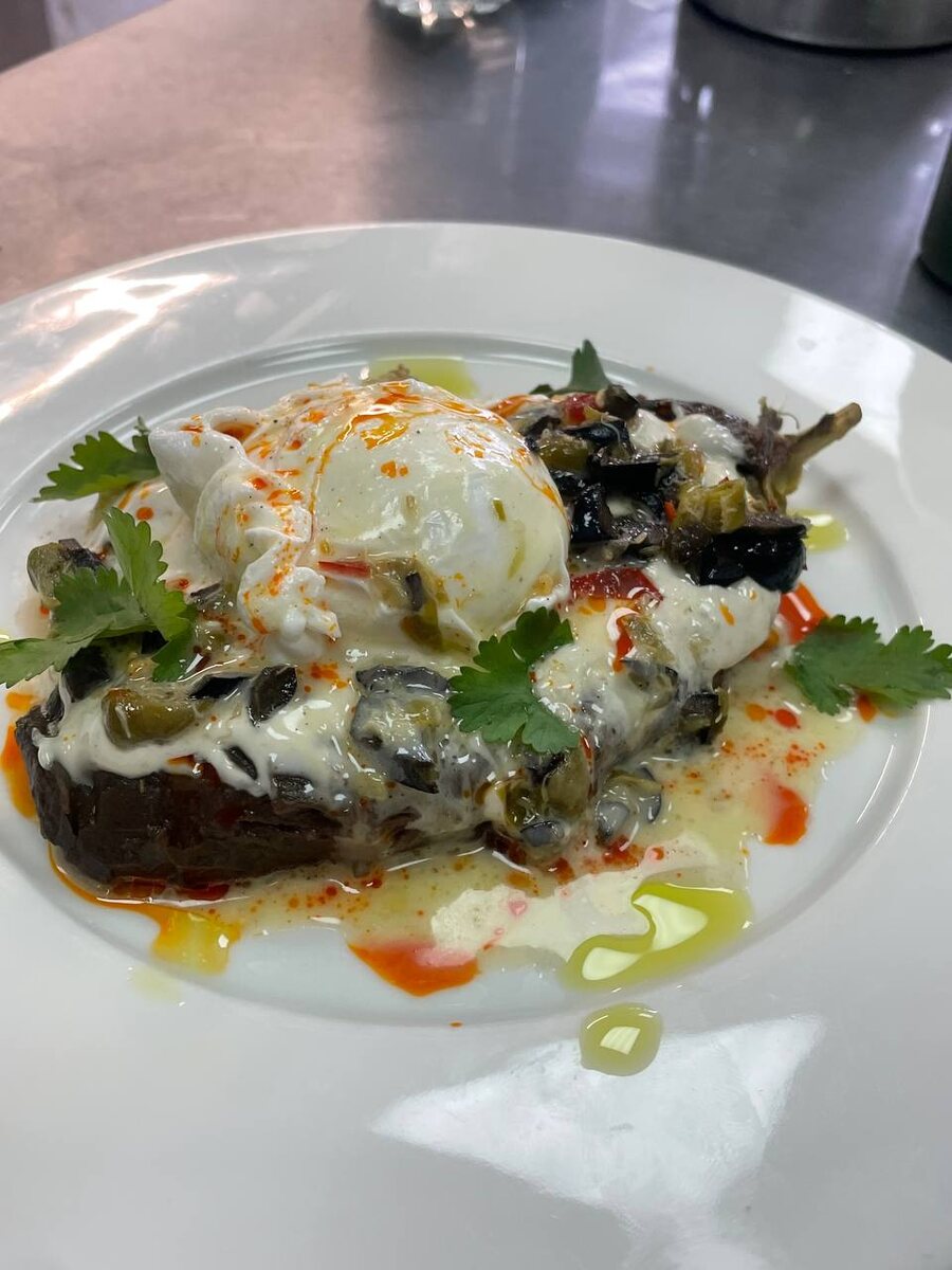 Баклажан )))под 3 мы соусами и яйцом пашот
