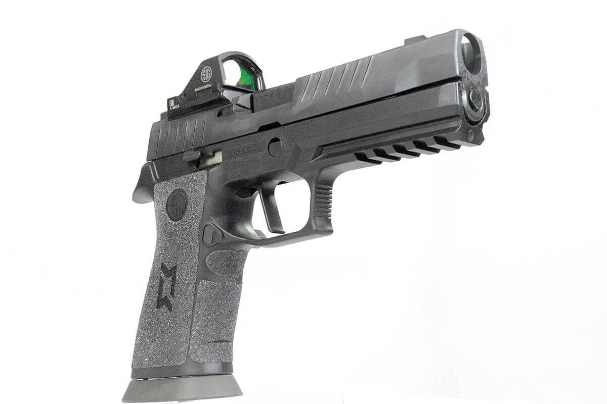 На первый взгляд, P320 M.O.D. похож на обычный P320 X-Five. Те же линии, та же полимерная рамка, тот же модульный огневой механизм (FCU). Но приглядитесь к дульной части. Вместо обычного затвора — интегрированная камера расширения с двумя портами в верхней части.