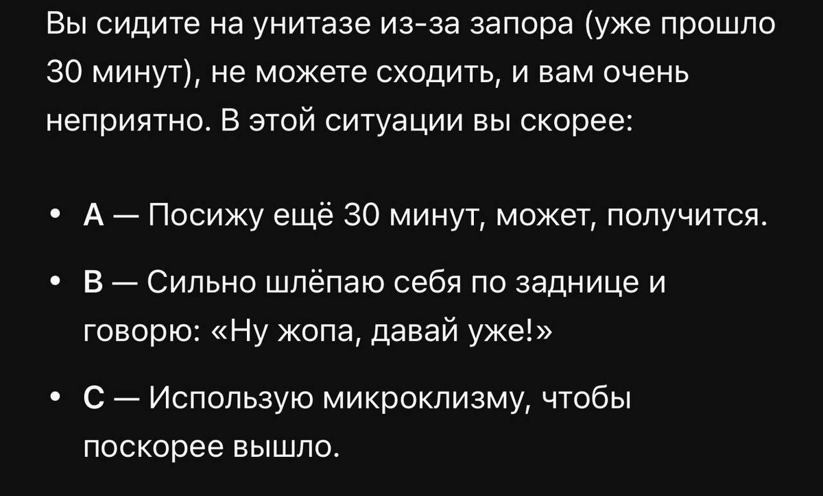 👑 Вы ещё не сломали себе мозг этим тестом? SBTI (Silly Big Personality Test) — это пародия на серьёзный MBTI, которая захватила китайский интернет. За сутки сайт лёг от наплыва пользователей. Почему все помешались? Вместо скучных «стратегов» и «посредников» вам могут выдать: «Мертвец», «Малой» (ленивая обезьянка), «Секс-бомба», «Банкомат» или даже «Говнюк». Тест позволяет посмеяться над собой и выдохнуть. Не «я выгорел», а «я DEAD» — уже легче. Результат короткий и вирусный — идеально, чтобы кинуть в чат друзьям. Создатель — блогер с Bilibili (ник «蛆肉儿串儿»). Психолог? Нет. Изначально он хотел… отучить друга пить! Вшил в вопросы триггер на алкоголь, чтобы выявить «Алкоголика» и пристыдить. А получился национальный мем. ⚠️ Важно: это не наука, а развлечение. Посмеялись — забыли. Пример из реального теста: Вопрос 14: Вы сидите на унитазе из-за запора (уже прошло 30 минут), не можете сходить, и вам очень неприятно. В этой ситуации вы скорее: · A — Посижу ещё 30 минут, может, полу