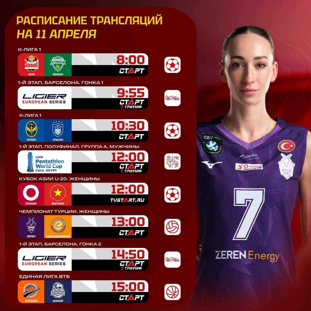 ! Утро субботы начинается с корейского футбола. Рано, зато бодро! Днем битва за медали в турецком волейболе, молодежный женский Кубок Азии и море европейского футбола, баскетбола и гандбола 🤩 UPD: Прямая трансляция матча «Бешикташ» — «Бахчешехир» недоступна, так как потерян сигнал по причине плохой погоды на территории источника. Подписывайся на ТВ СТАРТ в MAX📲