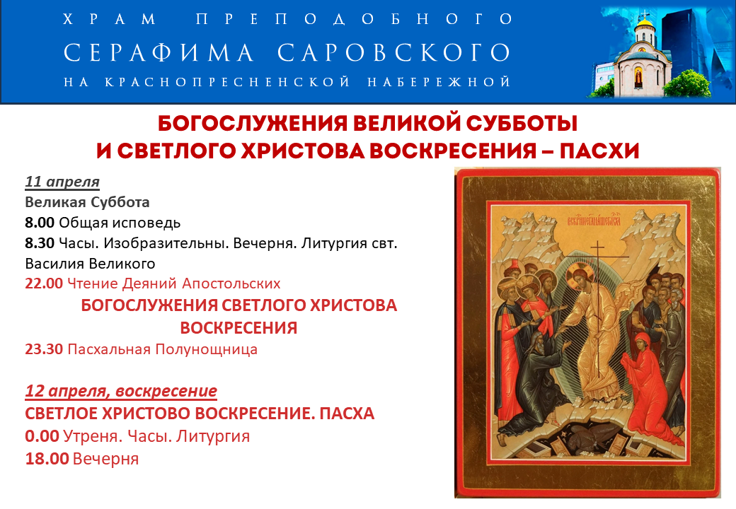 📅 11 апреля, суббота Великая Суббота 🕗 8.00 Общая исповедь 🕣 8.30 Часы. Изобразительны. Вечерня. Литургия свт. Василия Великого ✔ Освящение куличей в нашем храме начнется после утреннего Богослужения (примерно в 12.00) и будет совершаться до 19.00 🕙 22.00 Чтение Деяний Апостольских БОГОСЛУЖЕНИЯ СВЕТЛОГО ХРИСТОВА ВОСКРЕСЕНИЯ. 🕦 23.30 Пасхальная Полунощница 📅 12 апреля, воскресение ☀ СВЕТЛОЕ ХРИСТОВО ВОСКРЕСЕНИЕ. ПАСХА 🕛 0.00 Утреня. Часы. Литургия 🕕 18.00 Вечерня