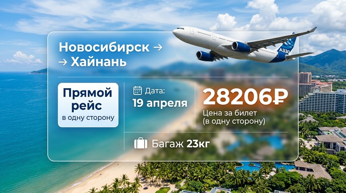 ! • Новосибирск — Хайнань, вылет 19 апреля, багаж 23кг включен — 28 206₽ • Москва — Шарм-эль-Шейх, вылет 13 апреля, багаж 10кг — 8 240₽ • Санкт-Петербург — Анталья, с 11 по 22 апреля, багаж включен — билет за 22 300₽ Бронируйте сразу, такие низкие цены долго не продержатся!