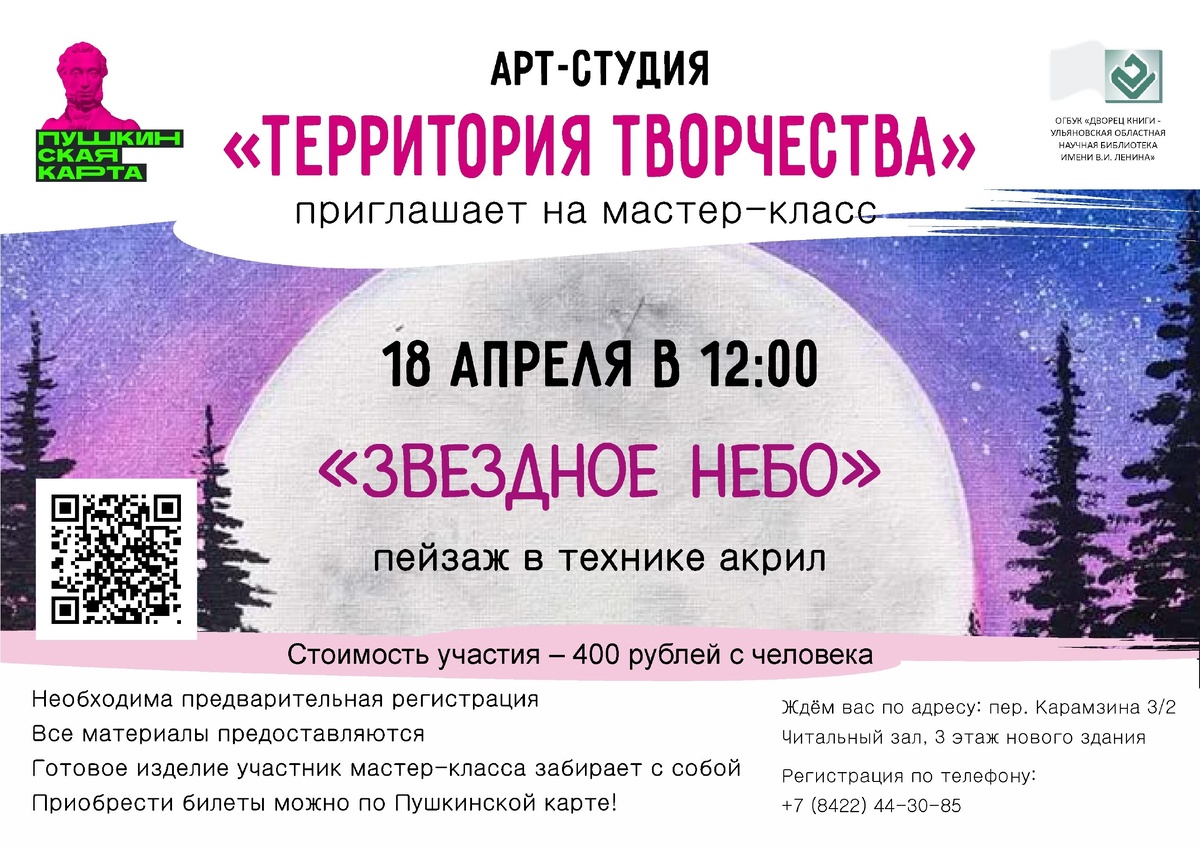 Хотите запечатлеть его красоту и неповторимость? Приглашаем на Арт-студию! 🌠 18 апреля в 12:00 состоится мастер-класс по пейзажной живописи «Звездное небо». Вы познакомитесь с разными техниками рисования и узнаете, как запечатлеть настоящую звездную ночь на бумаге. 👉 Подробнее - на сайте: https://clck.ru/3Sre7e Необходима предварительная регистрация! Все материалы предоставляются организаторами. Стоимость участия в мастер-классе – 400 рублей с человека. ✅ Приобрести билеты на мероприятия можно по Пушкинской карте: https://clck.ru/3SpyvA. С 2025 года программа реализуется в рамках национального проекта «Семья». Телефон для справок и регистрации: 8(8422)44-30-85 – читальный зал Дворца книги. #ДворецКниги_афиша