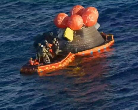 Эвакуация экипажа: после приводнения вокруг капсулы автоматически надулись стабилизирующие поплавки, которые привели её в вертикальное положение. Эвакуация проходила с использованием вертолётов. Астронавты поочередно покинули капсулу, перейдя на надувной плот, после чего их подняли на борт. Командир миссии Рид Уайзмен покинул корабль последним. Всего эвакуация заняла около двух часов.