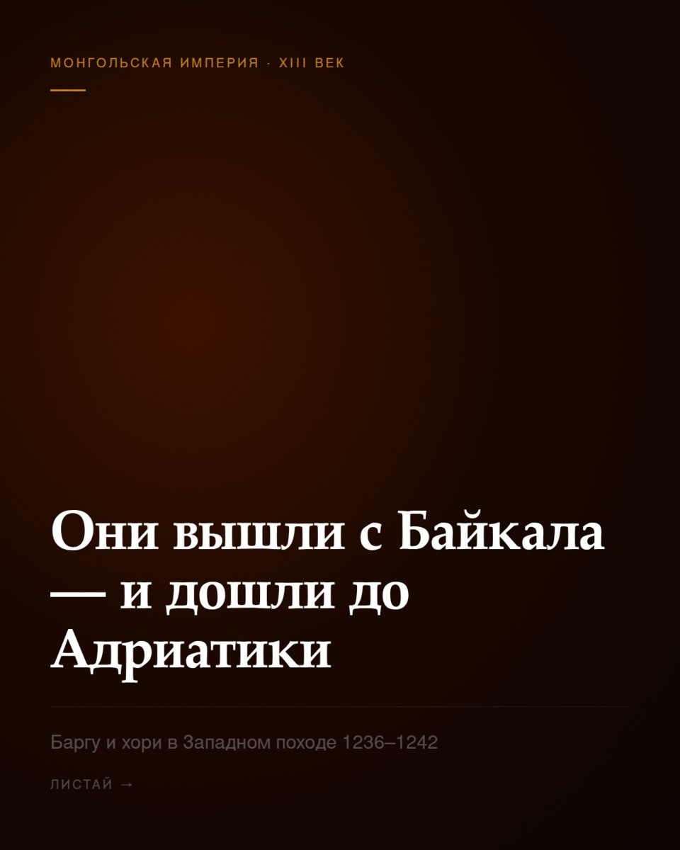 » В 1207 году они сдались без боя — и вошли в состав Монгольской империи. Через 28 лет их потомки стояли у берегов Адриатического моря. Баргу и хори — предки современных бурят — были мобилизованы в войска Субэдэя в ходе Великого западного похода 1236–1242 годов. Это зафиксировано в «Юань ши» (биография Субэдэя, цзюань 121): среди его контингентов прямо названы «балаху» и «хуоли» — так китайские хронисты записывали баргу и хори. Маршрут похода: разгром Волжской Булгарии → поход на Русь (Рязань, Владимир, Киев) → Польша → битва при Легнице, 9 апреля 1241 → битва при Мохи в Венгрии, 11 апреля 1241 → преследование венгерского короля Белы IV по Далматинскому побережью Адриатики. 4 000 километров от Байкала. По замёрзшим русским рекам, через польские леса, по берегу Адриатики. Некоторые погибли. Некоторые вернулись. Некоторые остались навсегда — осев в составе нового улуса Джочи, будущей Золотой Орды. Листайте карточки →