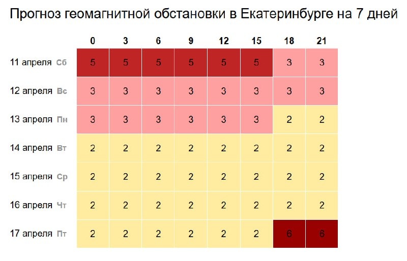 Сегодня в Екатеринбурге временами геомагнитная активность будет увеличиваться до пяти баллов по девятибалльной шкале. Метеозависимые могут почувствовать слабость, головную боль и недомогание. По прогнозам специалистов, после 15:00 ожидается снижение геомагнитной активности. 📷 Скрин: сайт Time-in