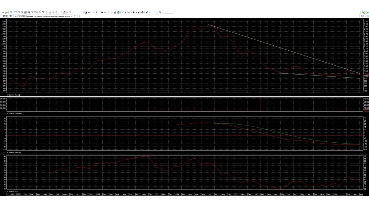 На дневном графике видим, слабо пониженный сужающийся коридор 900-1100. Начиная со 02 мая 2025 года по 25 января 2026 года акция находилась на линии поддержки слабо пониженного сужающегося коридора. Далее начался процесс роста к линии сопротивления этого коридора. Достигнув линии сопротивления коридора, быки не смогли пройти, акция стала двигаться под линией сопротивления. Медведи многократно пробовали заставить быков отступить к линии поддержки слабо пониженного сужающегося коридора, но этого не получилось сделать. Значит быки и медведи имеют равный баланс сил, даже в начале апреля 2026 года рекомендация от Совета директоров не помогла пробить линию сопротивления. Индикатор RSI сверху пробил уровень 30% и двигается к уровню 20%, индикатор MACD располагается под нулевым уровнем и двигается горизонтально. Объем торгов находится на минимальном уровне активности инвестора в акции. Это говорит, что в акции нет продавцов и покупателей, значит инвесторам временно акция не интересна. Даже сообщение Совета директоров, рекомендовать выплату дивидендов, не увеличило оборота торгов в акции. Скорее всего инвестор не верит, что дивиденды будут утверждены на акционерном собрании в мае 2026 года. Поэтому акция до середины апреля продолжит свое движение под линией сопротивления слабо сужающегося коридора.