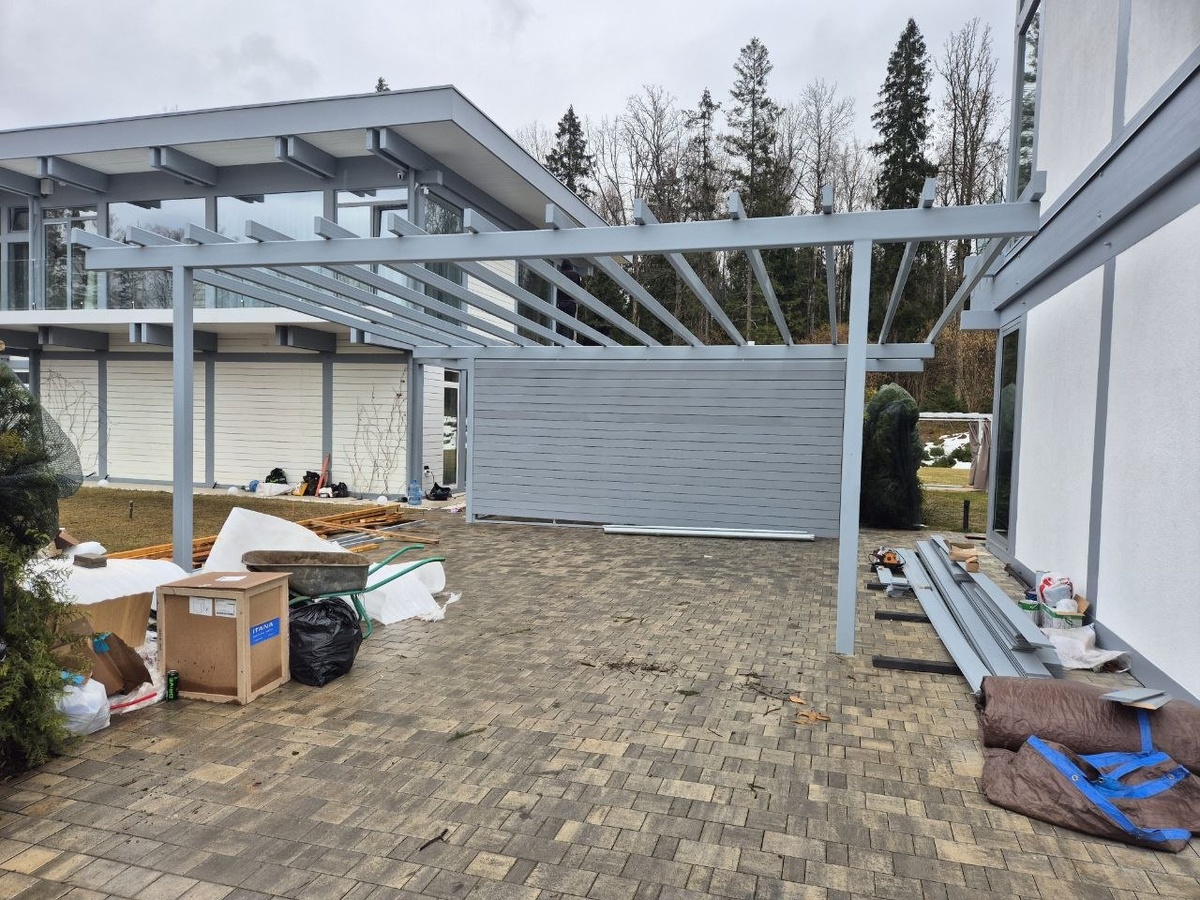 Возвели металлоконструкцию для навеса и террасы, теперь ждём когда произведут поликарбонат.