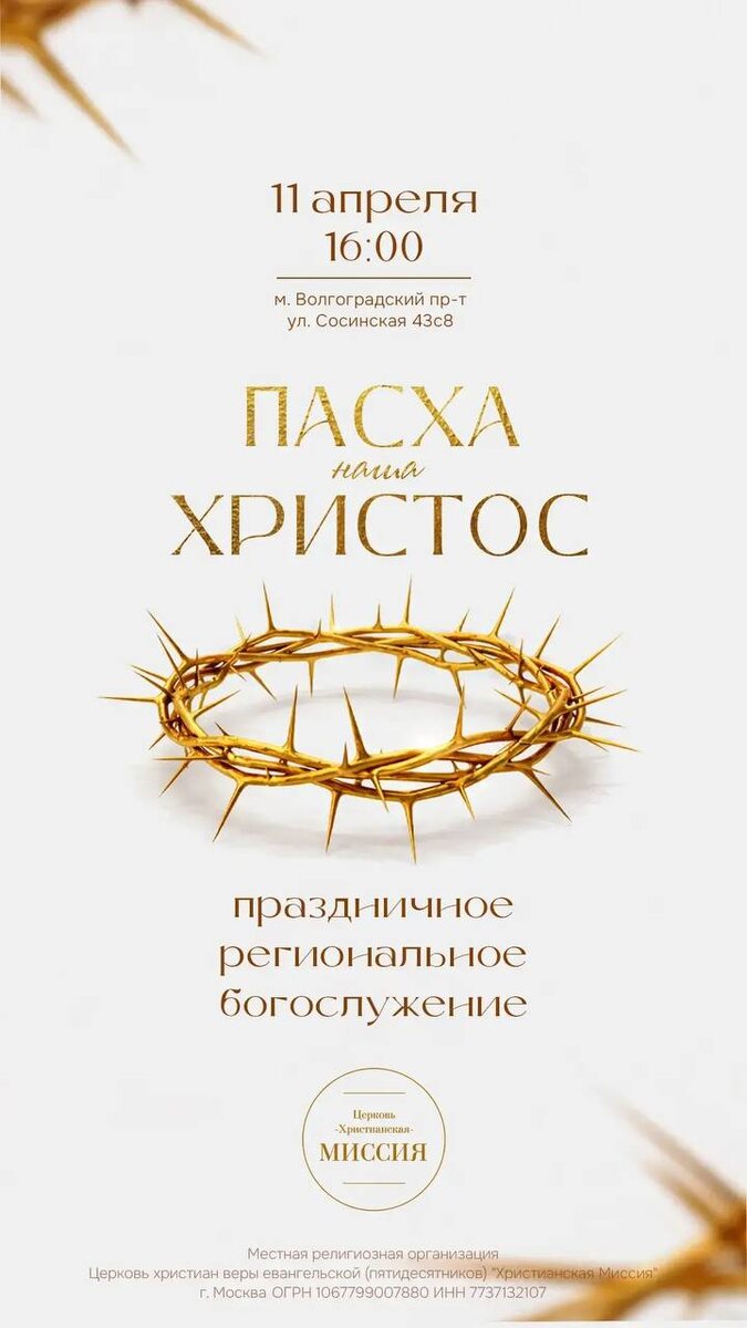 ! 🕊️ 11 апреля / 16:00 / Москва, ул. Сосинская, 43с8 Пасха — это праздник надежды, победы жизни над смертью, света над тьмой. Это особенное время, когда мы вместе можем прославить Воскресшего Христа, объединиться в молитве и наполнить сердце радостью. Приходите всей семьёй, приглашайте родных, друзей и близких 🧡 Пусть этот день станет для каждого временем мира, вдохновения и Божьего присутствия!