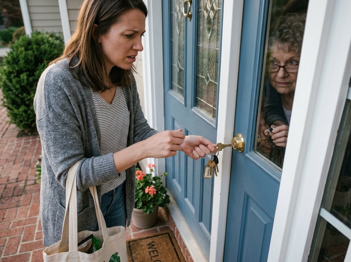 В подъезде пахло жареным луком и дешёвым освежителем воздуха. Мой чемодан одиноко стоял у лифта. Я вернулась из двухдневной поездки к родителям и меньше всего ожидала, что окажусь запертой снаружи собственной квартиры.