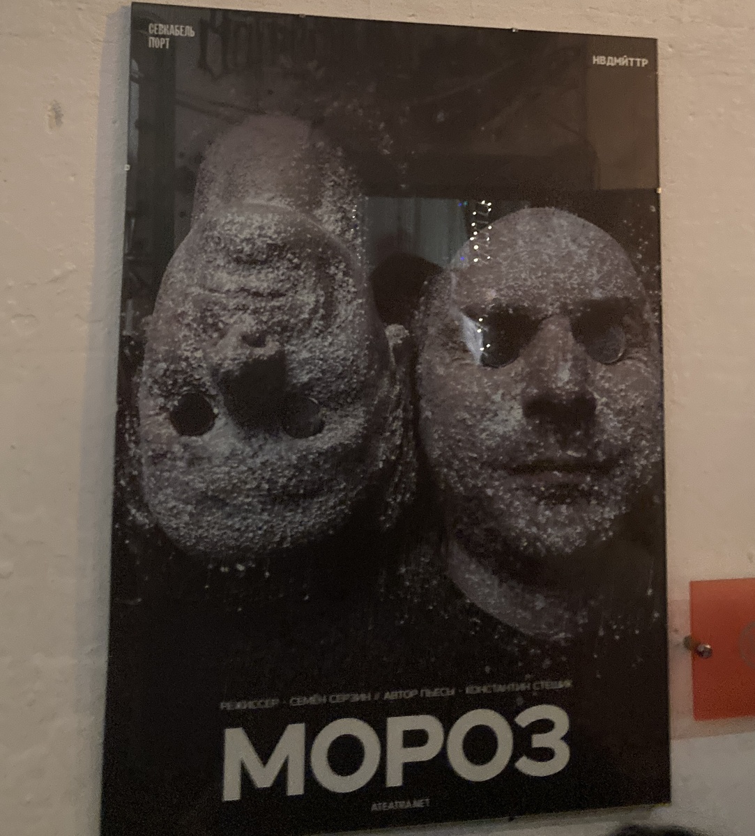 Т: Нет, я для себя ничего нового не вынесла. Ноль. Д: …Да? А мне спектакль понравился. В отличие от пьесы. Т: Перегружено как-то. Для меня была лишней иллюстративность и изобретательность. Телефон этот, например. Д: А как ещё рассказать мысли героя? Вот так — в самый раз. Т: И это ведь больше на рассказ похоже, чем на пьесу. Д: Да, именно. Такое и у меня впечатление сложилось, когда читал: короткая зарисовка. Как и зачем ставить — не понимаю. Поэтому и интересно было, что с этим сделает Серзин — сделал хорошо. Но катарсиса не было, ты права. Даже когда Олег на все деньги играл за столом. Т: Вопросов вообще нет к актёрам — они прекрасны. Но я бы предпочла, чтобы это просто была читка и 800 рублей за билет. Тогда и затрат было бы меньше. Ты видел, сколько теперь человек в бэкстейдже задействовано? Штыри опять же эти к стене приварить — это же целая отдельная задача. Д: Штыри меня порадовали. И то, что Семён заставил их траверс лезть. Жду боулдер-стену в следующем спектакле. А по людям —