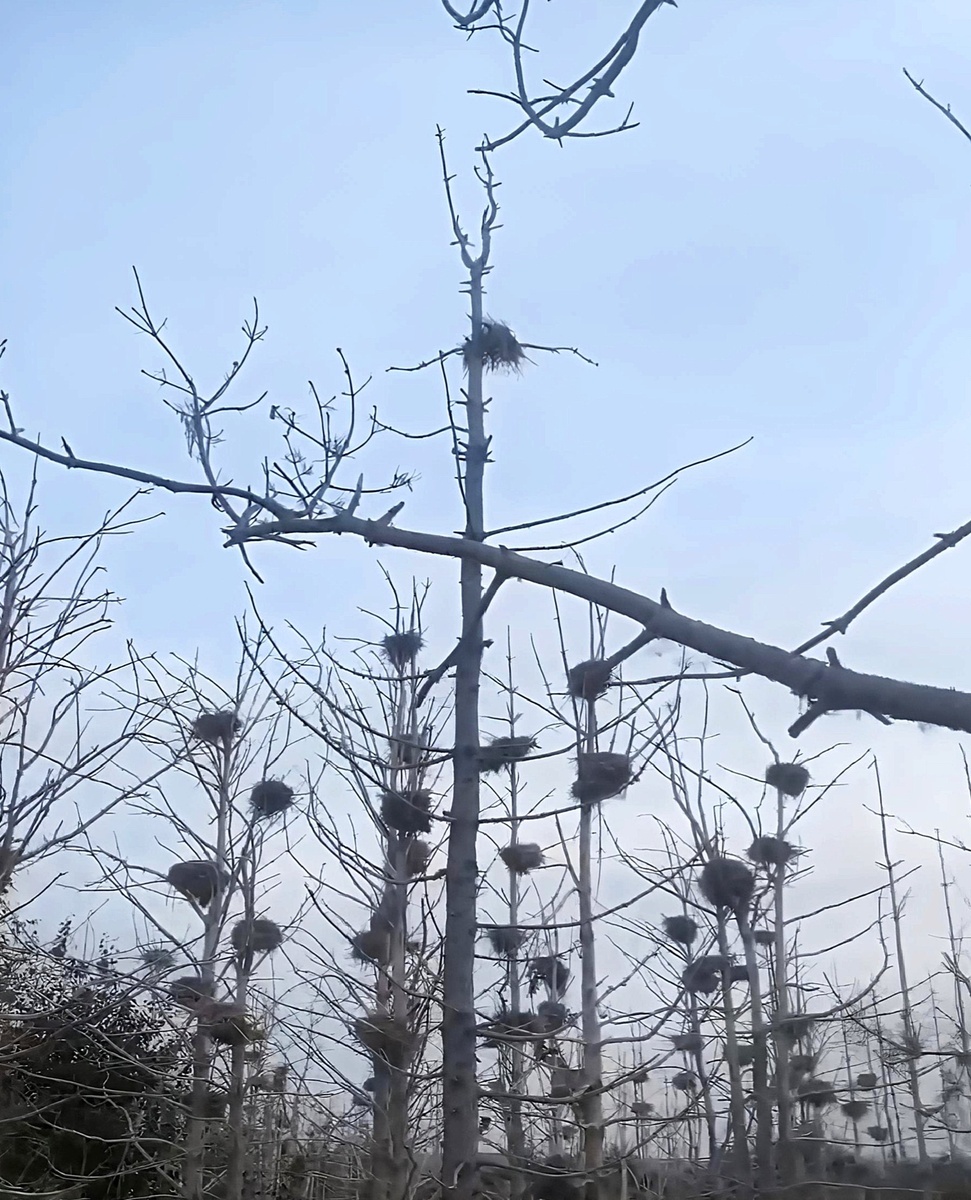 Жуткий вид: остовы деревьев усеяны гнёздами птиц.