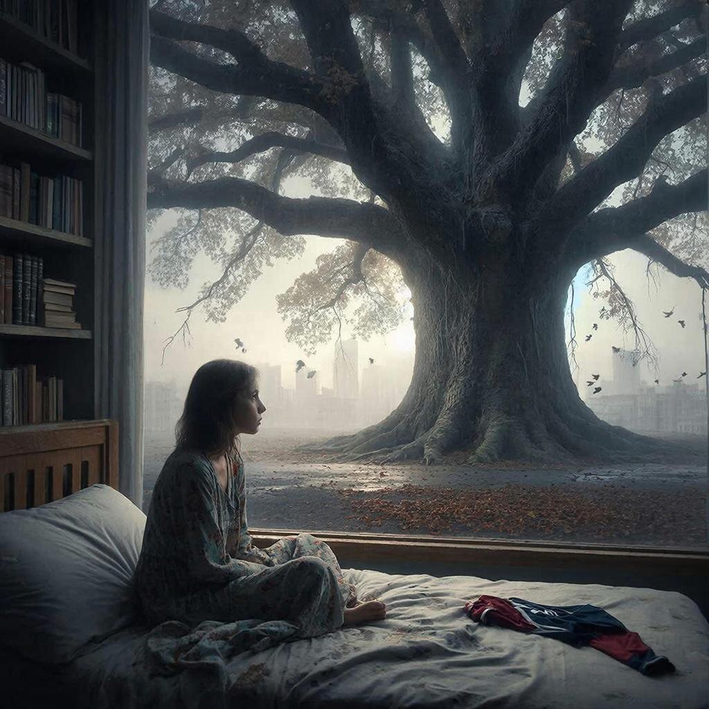 Книга: ТРОПА Глава №8: Страхи Кэти проснулась задолго до того, как город начал подавать первые признаки жизни. В комнате царил сумрак, разбавленный лишь слабым, жемчужно-серым светом, который с трудом пробивался сквозь плотную листву старого клёна за окном. Воздух был пропитан запахом прелой листвы и влажной земли — этот густой, землистый аромат всегда возвещал о приходе осени. Птицы не щебетали, а лишь изредка издавали короткие, тревожные трели, словно предупреждая о чём-то, что ещё неведомо людям. Кэти села на кровати, обхватив колени руками. Её взгляд упал на дерево — исполина, чей могучий ствол она знала на ощупь с самого детства. Когда-то это был её трон, её наблюдательный пункт, с которого она, словно юная королева, взирала на мир. Она помнила, как легко взбиралась по шершавой коре, как ветки прогибались под её весом, а сердце замирало от восторга и высоты. С макушки было видно всё: и чопорную миссис Смит, которая с видом инквизитора выводила своего разжиревшего кота на травку к