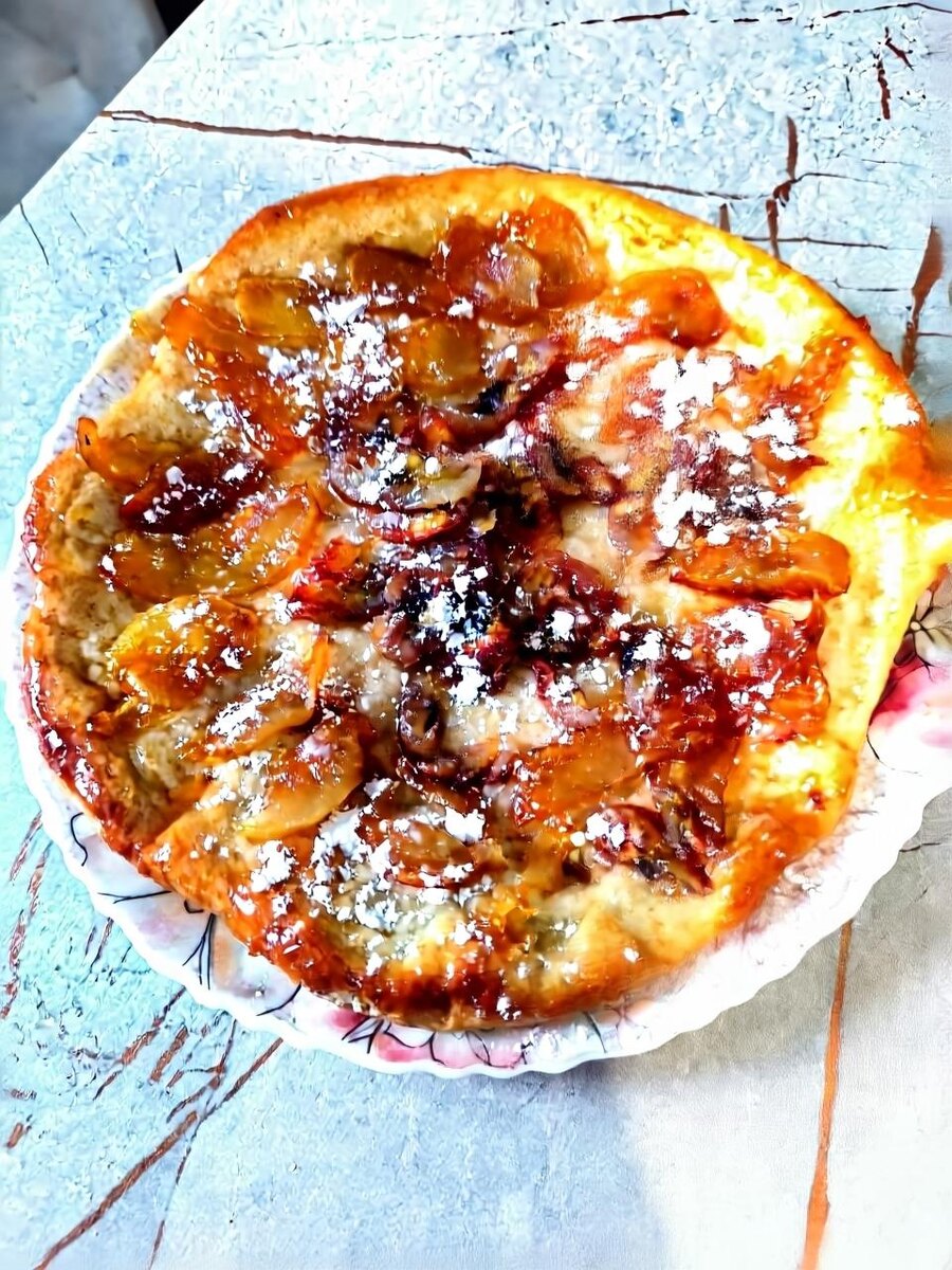 Растопить на сковороде без ручек сахарный песок со сливочным маслом . Яблоко очистить от кожуры и порезать слайсами . На растопленный сахар выкладываем веером яблоко , можно посыпать корицей. Выключаем , даем отстыть. Сверху накрываем яблочную начинку расскатаным в круг тестом. Делаем вилкой дырочки на поверхности. Сковороду отправляем в разогретую духовку при 200 градусах на 15 минут.