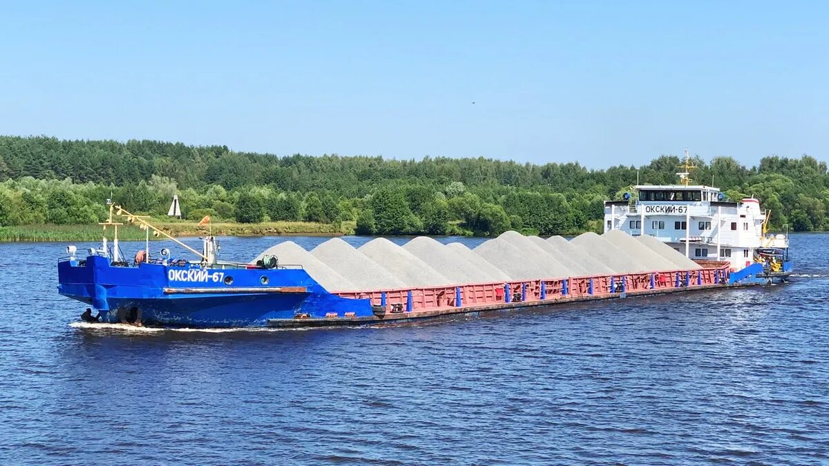 В кадре появляется серьезно загруженное грузовое судно, которое сразу привлекает внимание своей осадкой и ходом. Перед нами теплоход «Окский-67» — двухвинтовой сухогрузный теплоход-площадка, идущий вверх по Верхней Волге. Мы можем отлично рассмотреть судно сбоку в процессе движения. «Окский-67» заметно глубоко сидит в воде из-за полной загрузки, но при этом уверенно держит курс и продолжает движение против течения. Для хода вверх по Волге требуется стабильная тяга и точное управление, и двухвинтовая энергетическая установка дает судну необходимый баланс мощности и маневренности. Конструкция теплохода хорошо различима даже на расстоянии: открытая грузовая палуба, рассчитанная на перевозку различных типов грузов, компактная надстройка и машинное отделение в кормовой части. Такая компоновка типична для речных сухогрузов и позволяет максимально эффективно использовать грузовое пространство. По мере продвижения «Окский-67» вверх по реке, по характеру обтекания корпуса и следу за кормой вид