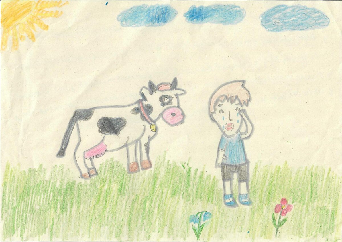 Описание: "На моём рисунке солнце, облака, цветы, трава, испуганный мальчик Вова и большая корова. Вова её боится, он плачет, но корова не уходит. Я думаю, что это шуточное стихотворение."