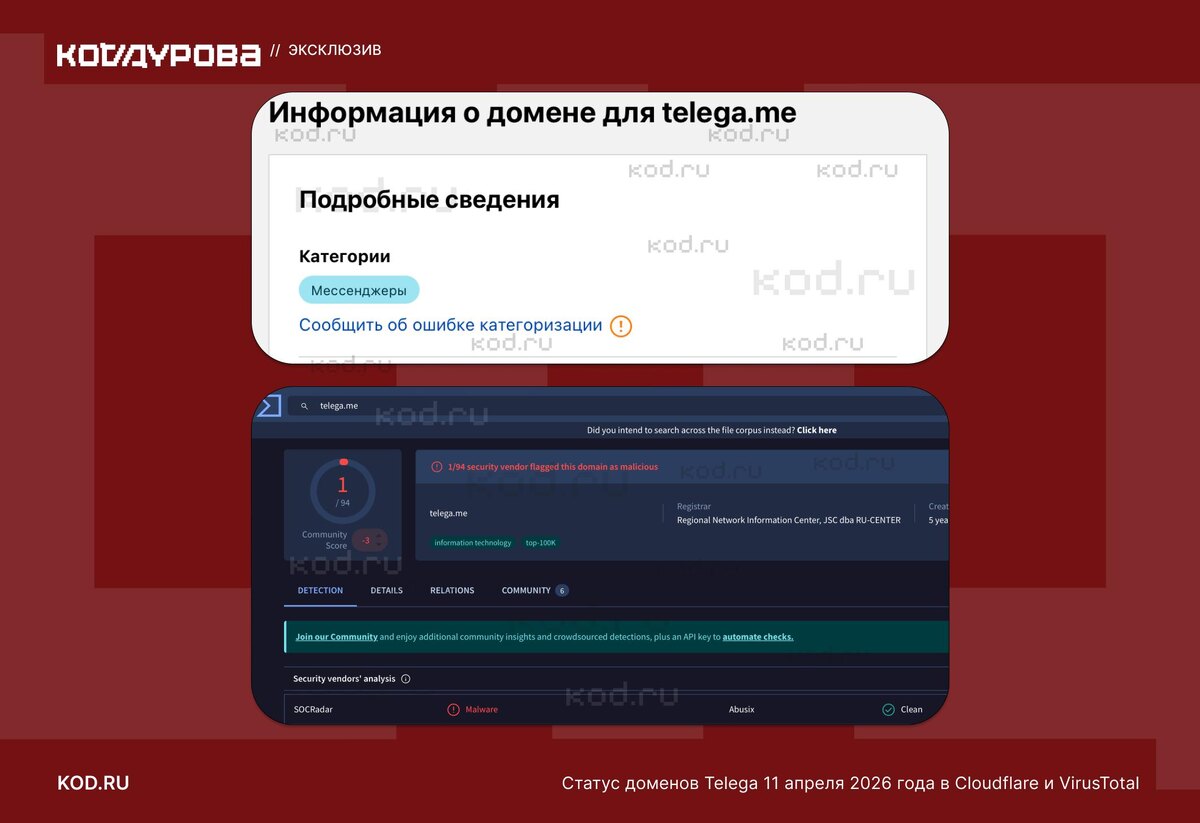 Cloudflare отозвал статус «шпионского ПО» у рабочих доменов Telega через полтора дня после его добавления, пишет «Код Дурова», однако статус
