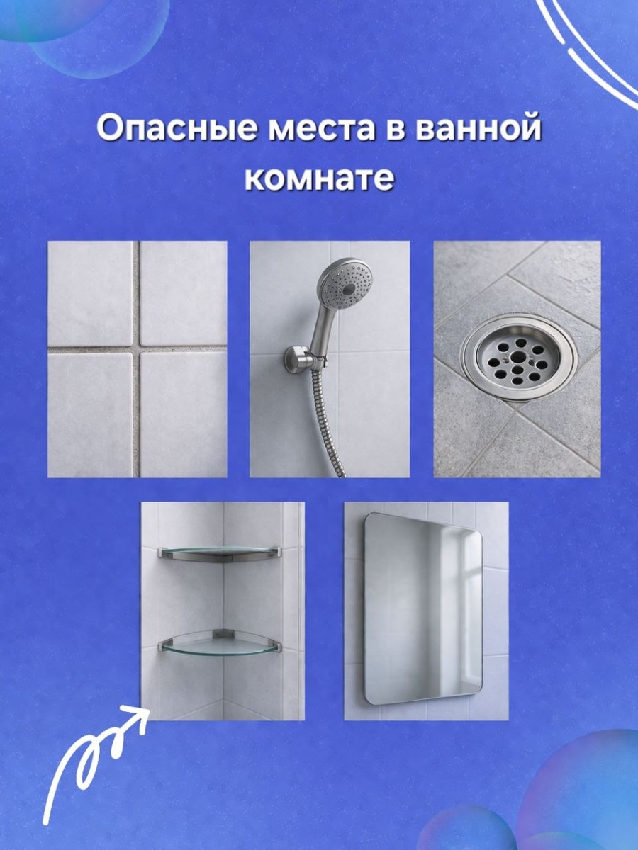 ⚪️Затирка между плиткой (там любит жить плесень) ⚪️Душевая лейка и шланг ⚪️Сливные отверстия ⚪️Полочки и держатели ⚪️Зеркало (мыльный налёт) Совет: после каждого душа проветривайте и протирайте насухо — это сильно снижает образование плесени