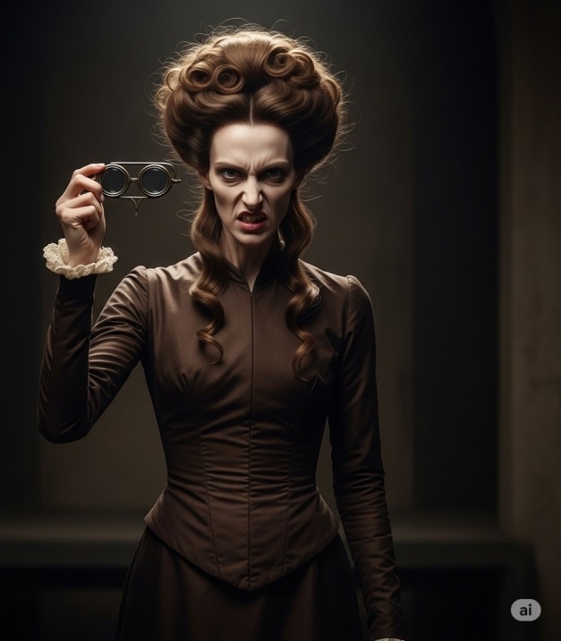 Пока Пончик осматривался, фигура подошла совсем близко. Это была высокая сухощавая дама с пышной прической, одетая в старомодное длинное платье. Она смотрела на Пончика в лорнет, и похоже, ей не слишком нравилось то, что она видела. Хмыкнув, дама сложила лорнет, и он повис на цепочке, прикрепленной к поясу ее платья, где висели еще какие-то штучки.
