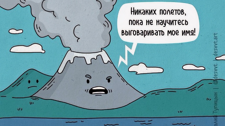 «Туркменский президент Гурбангулы Мяллиулаевич Бердымухамедов посетил вулкан Эйяфьятлайокудль. Итог — массовые самоубийства дикторов новостных программ». Этот и другие анекдоты заполнили интернет в апреле 2010 года. И действительно, произнести название начавшего извержение исландского вулкана Эйяфьятлайокудль, было непросто даже после тренировки. И не только российским дикторам, но и их европейским коллегам. Исландская певица Элиза Ньюман даже оперативно сочинила песню с припевом: «Ei-ya-fya-tla-yo-kutl» — под гитару, как детскую считалку. Ее крутили по CNN и BBC, чтобы «обучить народ». Но и это помогало слабо. В конце концов, дикторы сдались и придумали Эйяфьятлайокудлю сокращенное название «Эйя». Это извержение запомнилось не только монструозным названием вулкана, означавшего, к слову, всего лишь «ледник островных гор». Но и тучами пепла, которые на шесть недель парализовали авиасообщение над Европой. Но что такого было в этом пепле, ведь его объем трудно назвать рекордным по меркам