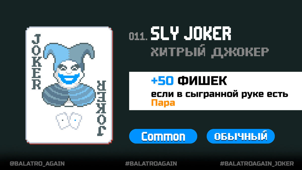 #jokers Начинаем серию джокеров, дающих стабильное количество фишек за комбинации. Хитрый джокер (Sly Joker) — простой джокер, дающий +50 фишек за любую руку, в которой есть пара. То есть за любую руку, кроме Старшей карты, ведь при определенных махинациях с джокерами, он может работать и на стритах, и на флэшах, и на стрит-флэшах (например джокер 4 пальца в помощь). Из преимуществ: +50 фишек, это хоть и не очень много, но, так сказать, больше, чем ноль :) Комбинации с парами собираются легко, поэтому при определённых условиях в начале игры, это может быть полезным. Особенно на плазменной колоде, где фишки ценяться больше, чем мульт. ✔️ Весёлый джокер. Даёт +8 множителя за комбинацию с парой. Этого товарища мы уже рассматривали. ✔️ Дуо. Этот джокер даёт x2 множителя за комбинации с парой. Полезная история. ✔️ Полуджокер. А этот товарищ и вообще даст +20 множителя, НО в случае если играются не более 3 карт за раз. Так что тут джокер в помощь в случае исключительно сетов и пар, на каре б