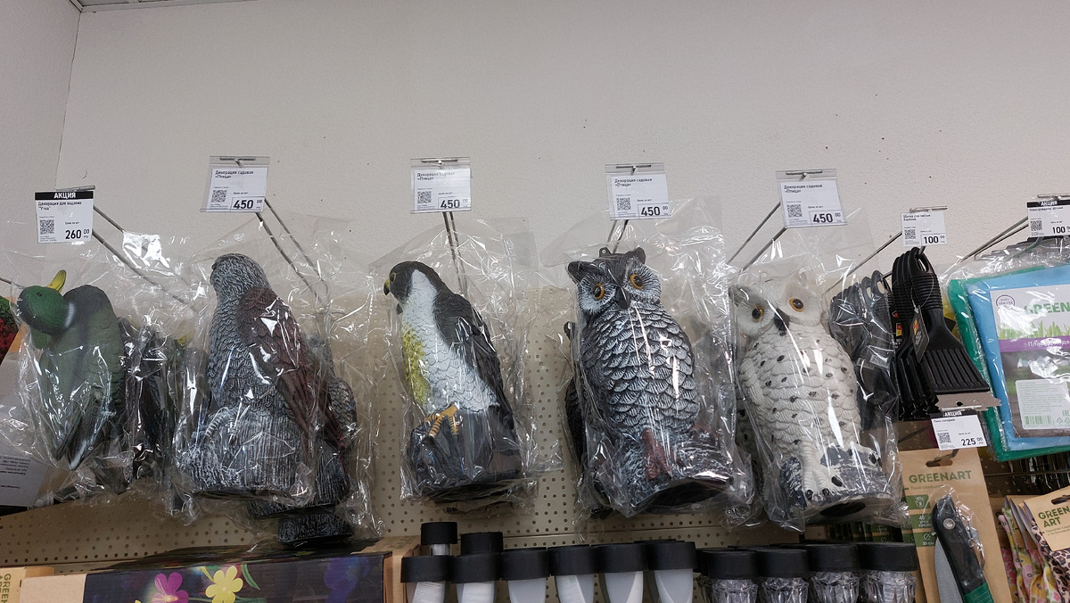Декоративные фигуры птиц - на полке представлен большой выбор реалистичных садовых декораций, упакованных в пленку. Здесь можно увидеть утку, ястреба (или сокола), а также два вида сов — серую и белую полярную. Стоимость таких фигур составляет 450 рублей. Они служат не только украшением, но и помогают защитить урожай, отпугивая настоящих птиц своим грозным видом.