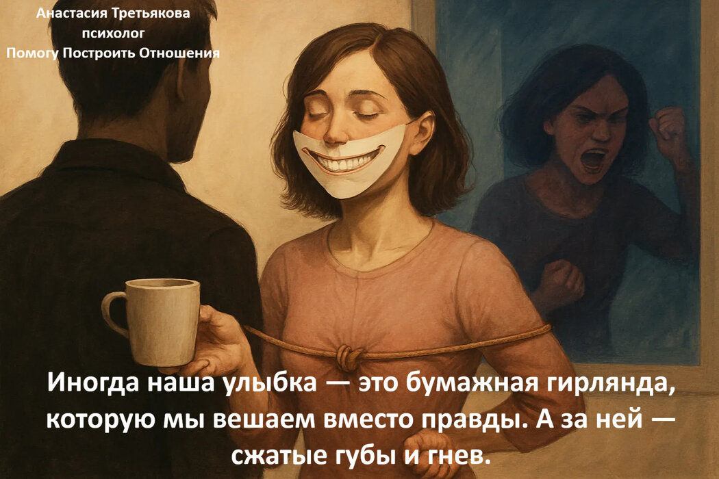 "Я не могу сказать нет мужчине, а потом злюсь на себя", - эту фразу я слышу на консультациях снова и снова. Клиентки описывают ощущение ловушки в собственном согласии, стыд после очередного «да», которое рвалось наружу как «нет». И глухое раздражение на себя, которое копится месяцами. В статье рассмотрю, что происходит внутри, когда мы соглашаемся из страха, а не из желания. И почему данная привычка мешает строить настоящие, близкие отношения. Он попросил меня остаться и помочь, и я осталась. Хотя устала, хотя хотела домой. Я улыбалась и помогала. А внутри что-то сжималось. А потом сидела в машине и плакала. Не от обиды на него. От злости на себя. Снова. Опять. Почему я не могу просто сказать — нет? 💭 Мысли Когда кто-то о чём-то просит, в голове моментально запускается целый судебный процесс. «Если откажу — он подумает, что я эгоистка». «Нельзя разочаровывать людей». «Со мной перестанут общаться». «Хорошая женщина так не делает». Эти мысли кажутся разумными и даже благородными. Но за