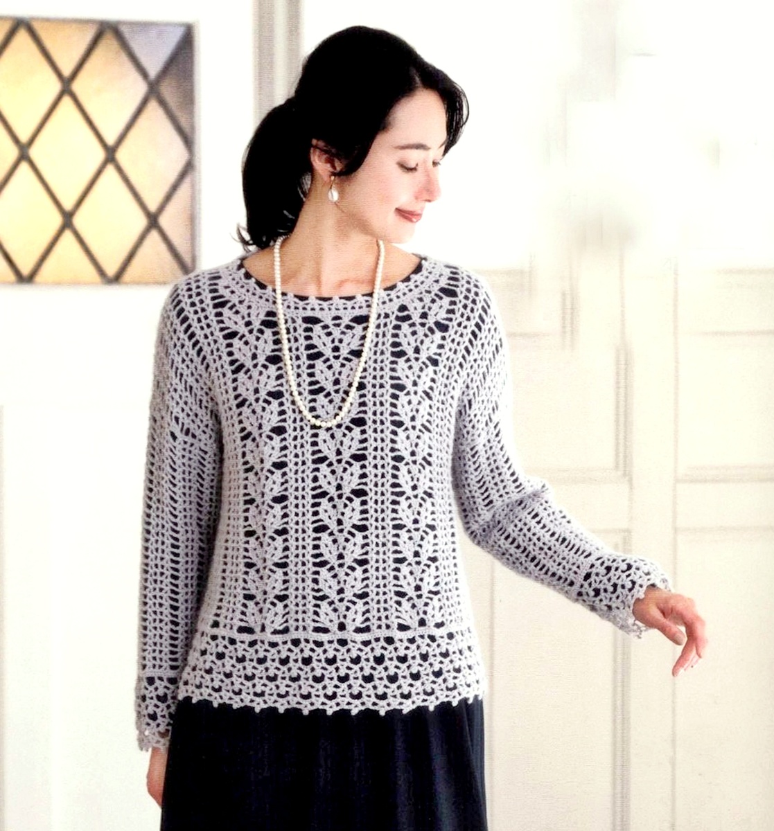 № 1: Серый пуловер с узором из листьев и кружевной каймой ♥