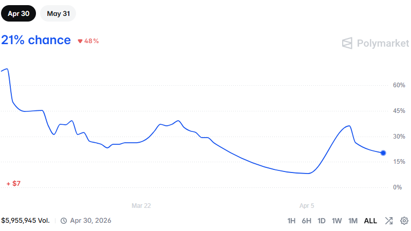 Polymarket: вероятность нормализации судоходства в Ормузском проливе к концу апреля оценивается всего в 21%