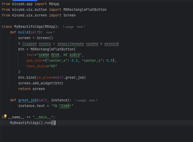 Признавайтесь честно. Когда вы показываете другу своё приложение на Python с интерфейсом на Tkinter, он делает такое лицо, будто вы показали ему фотографию своего первого сайта на Geocities из 1998 года? Серые прямоугольники, кнопки из прошлого века, а шрифты напоминают матричный принтер? Успокойтесь, всё в порядке. Вы просто не знали про KivyMD. Это библиотека, которая превращает вашего «питона» в нечто, похожее на современный мобильный или десктопный интерфейс в стиле Google Material Design. Тот самый, где кнопки прыгают, поля ввода светятся, а анимации заставляют пальцы чесаться. В этой статье я научу вас, как за 5 минут сделать из «серого мыша» приложение, которое захочется показывать даже на собеседовании. Поехали на лифте в мир красоты! А Kivy (и его надстройка KivyMD) — это как Lego для взрослых. Вы просто берете готовые виджеты: MDRectangleFlatButton, MDTextField, MDCard. И они уже умеют красиво летать, светиться и адаптироваться под любой экран. Открываем терминал. Если у вас