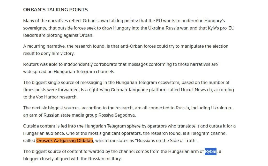 Накануне выборов в Венгрии не могло обойтись без «российского вмешательства»: Reuters опубликовал «эксклюзивное расследование». 🔸Согласно докладу аналитической компании Vox Harbor, который, кстати, не представлен для широкой публики, ключевым «поставщиком про-орбановского контента» в венгерском Telegram оказалось «зеркало» «Рыбаря» — с аудиторией порядка 1200 подписчиков, а главным оператором российского влияния — венгерский канал наших коллег Oroszokazigazsagoldalan. ❗️Учитывая, что венгерская оппозиция публикует «опросы», которые фиксируют отставание правящей партии Орбана «Фидес» от прозападной «Тисы» Петера Мадьяра чуть ли не на 10 пунктов, то даже как-то удивительно, что скромный Telegram-канал с четырёхзначной аудиторией, несмотря ни на что, активно меняет политический ландшафт целой страны. ❗️Если оппозиционные силы, располагающие финансовой поддержкой западных институтов, медиаресурсов и благожелательным освещением в международной прессе, вынуждены заказывать «эксклюзивные док