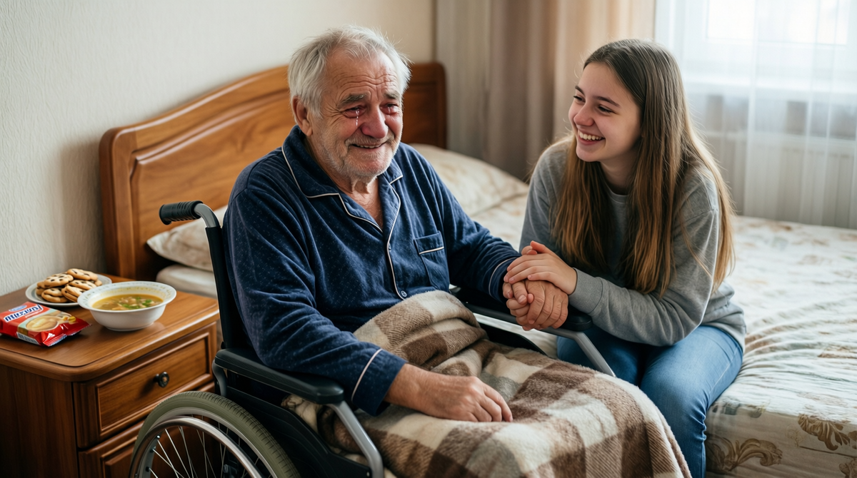 — Проснулся, дедуль? — Юля села на край кровати, где лежал дедушка. — Ну вот и хорошо. Давай я помогу тебе сесть. Сейчас будем есть суп.