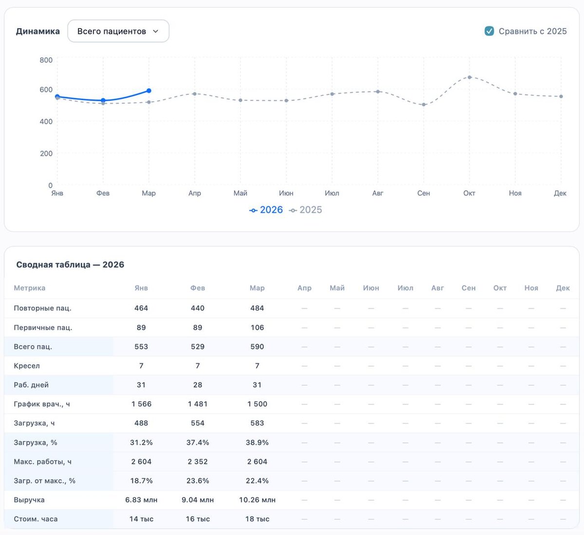 Еще в прошлом месяце мы выкатили функционал просчета эффективности клиники в сервисе Сколько денег. Этим разделом уже пользуются коллеги. Вчера я заполнил сам и получил удовольствие. Что здесь есть: • учет пациентов • просчет загруза • анализ загруза по врачам/пациентам • анализ стоимости часа работы • выручка • анализ предыдущих периодов и сравнение с текущим Базовые показатели, которые нужно анализировать каждый месяц. Наша программа позволяет собирать их в одном окне. А также отправляет уведомления-напоминания в ваш рабочий чат, если видит, что данные не заполнены. Стоимость сервис 5,000 руб. Ссылка на сайт: https://skolko-deneg.ru В базу знаний сегодня записал уроки по этому разделу.