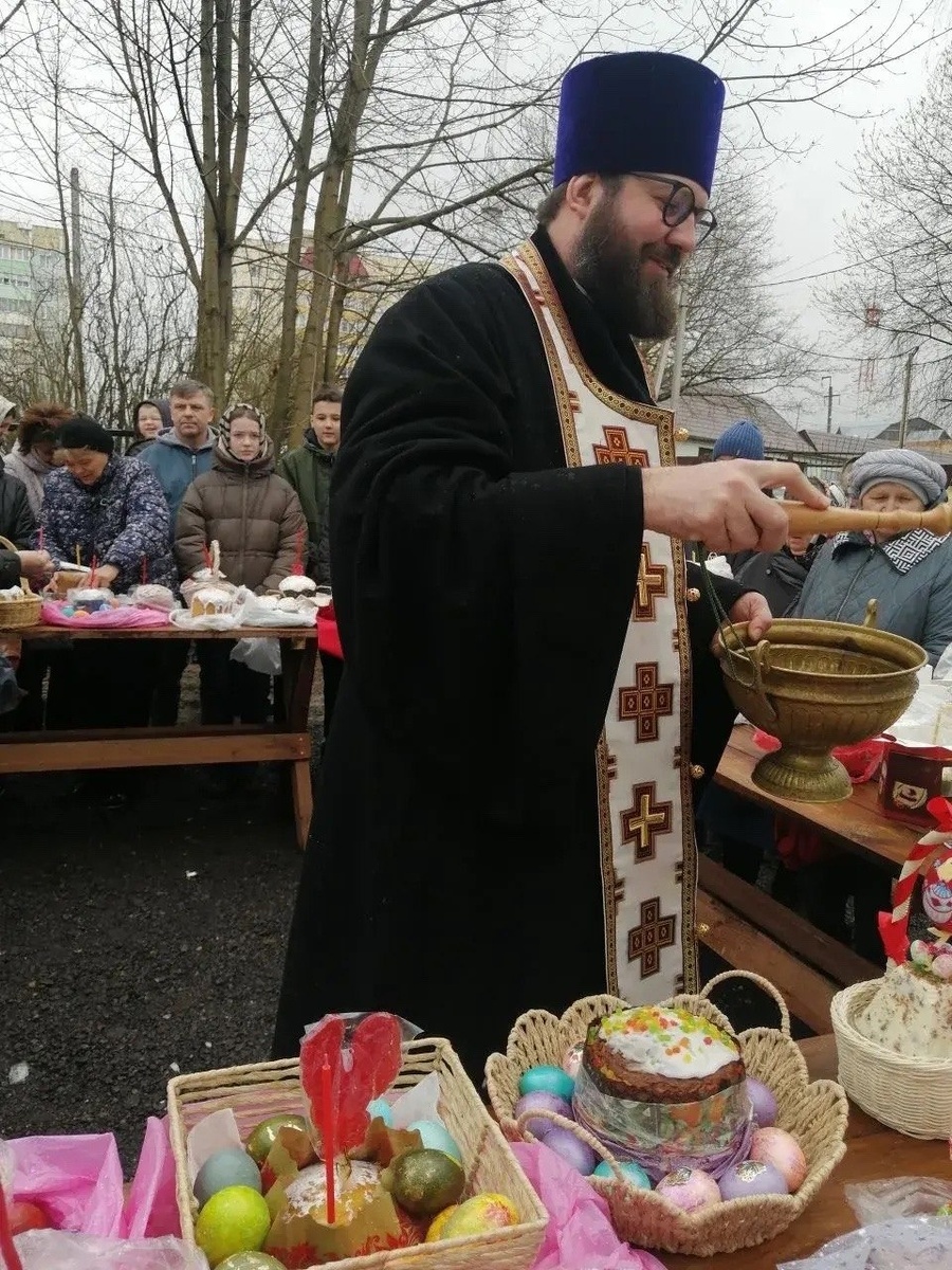 Несмотря на непогоду в церкви Архангела Михаила идёт освящение даров, куличей, пасхальных яиц накануне Светлого Христова Воскресения