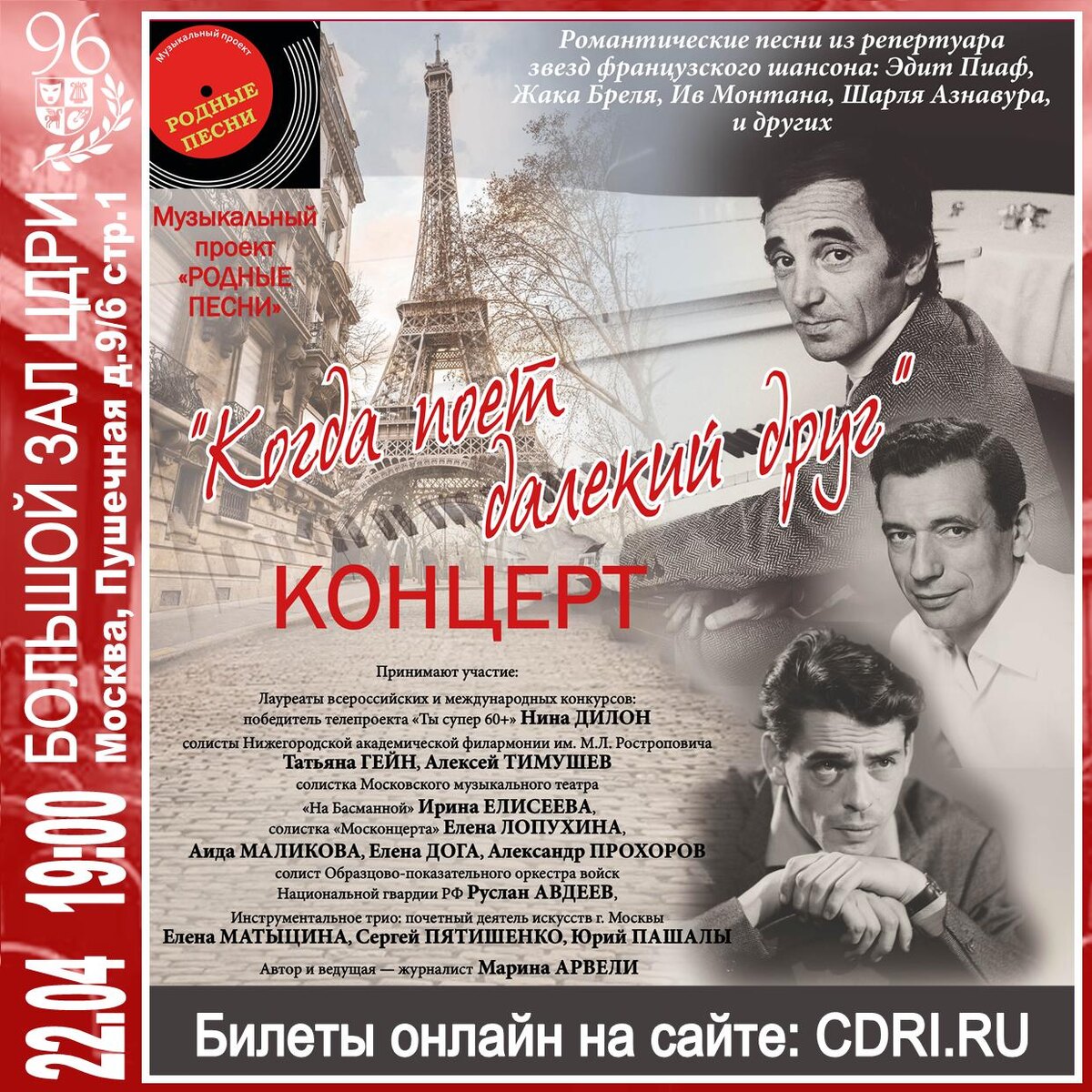 Романтические песни из репертуара звезд французского шансона: Шарля Азнавура, Ив Монтана, Жака Бреля и других В их этих песнях важным всегда оставался текст, для которого музыка, при всей ее красоте, оставалась обрамлением. В шансоне принято петь те стихи, которые написал ты сам и почти всегда они связаны с биографией и чувствами наших героев. Жак Брель и Шарль Азнавур писали музыку и тексты о себе, в одиночку пели и сами себе аккомпанировали, их выступления были театральны. Многие из них стали кинозвездами: Ив Монтан, Далида, Морис Шевалье. C именем Ив Монтан ассоциируются шлягеры «Опавшие листья», «Сэ си бон», фильмы «Врата ночи», «Миллиардер», он был выдающимся актером и замечательным шансонье. В программе концерта несколько композиций Шарля Азнавура: «Une vie d’amour» — одна из его самых знаменитых песен которую он исполнил вместе с Мирей Матье, специально для кинофильма «Тегеран-43». «La Bo